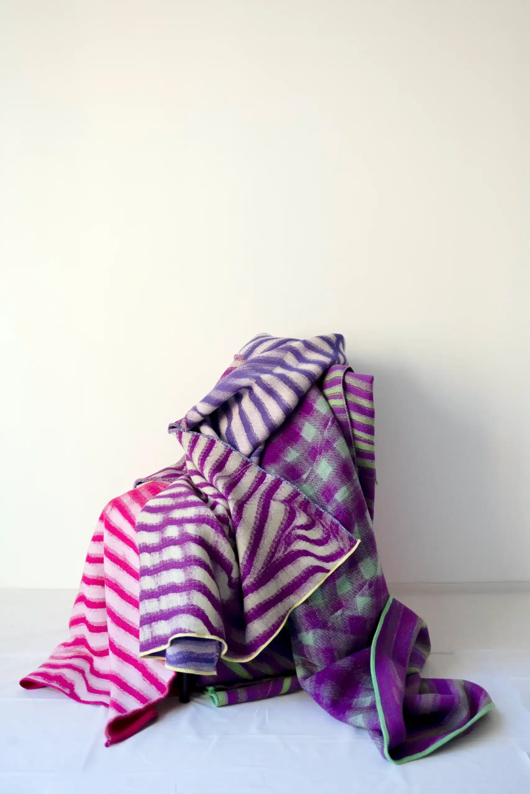 Horizontalité : des plaids jouant sur des effets recto-verso surprenants : d’une seule pièce de laine émergent deux visages, deux gammes chromatiques, deux graphismes qui dialoguent dans un jeu de trompe-l’œil.